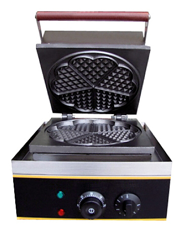 Фигурные вафли. Корпус выполнен из нержавеющей стали. Форма вафель - "сердце". Размер готового продукта 230х25х60 мм. Термостат и таймер. Рабочая поверхность с антипригарным покрытием. Мощность 1.5 кВт. Напряжение 220 В. Габаритные размеры 340х310х250 мм.