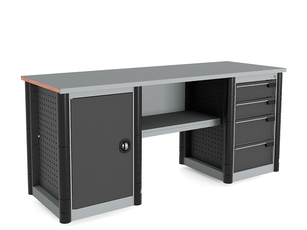 - Боковые прорезиненные бампера на тумбе и опоре защищают торцы верстака от непреднамеренного повреждения