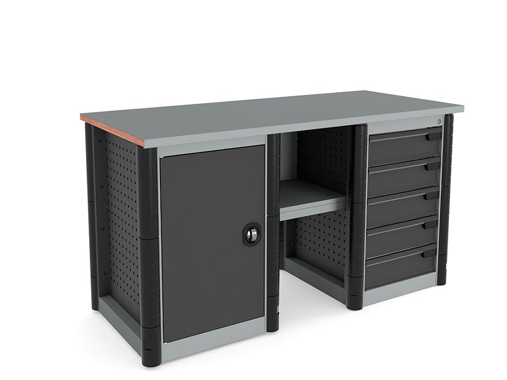 - Боковые прорезиненные бампера на тумбе и опоре защищают торцы верстака от непреднамеренного повреждения