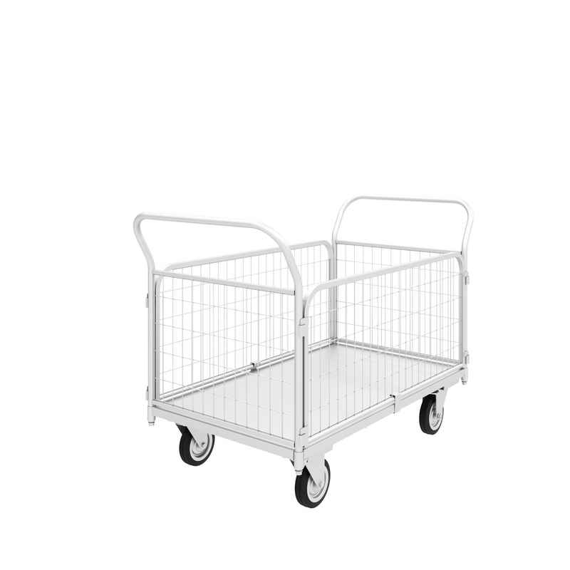 Гальваническое покрытие металлической платформенной тележки позволяет работать на открытом воздухе при атмосферных осадках. Быстросъемные сетчатые борта (ТС) удобно подходят для транспортировки товаров и грузов различных форм и габаритов.